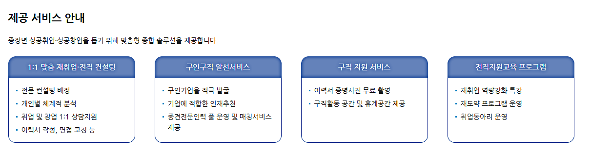 또한 만 50세 이상인 분들에 한해서 단계적, 유형적으로 고용지원을 비롯해 취업알선 등 맞춤 종합 솔루션도 제공해주고 있기 때문에 해당되는 분들은 이용해 보면 좋을 것 같습니다. 이상으로 중장년 일자리 희망센터 국비지원에 대해서 알아보았습니다.